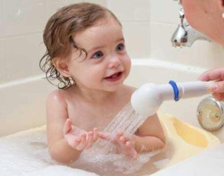 3. ابدئي بوضع قدم الطفل في الماء الدافئ  تدريجيا واسكبي الماء على جسمه باستمرار حتى لا يشعر بالبرد.