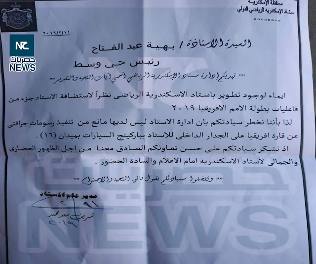 استاد الإسكندرية للتعبير عن كأس الأمم الإفريقية 2019 المقرر إقامتها في مصر، بعد الحصول على موافقة من شريف سعد محمد مدير عام استاد